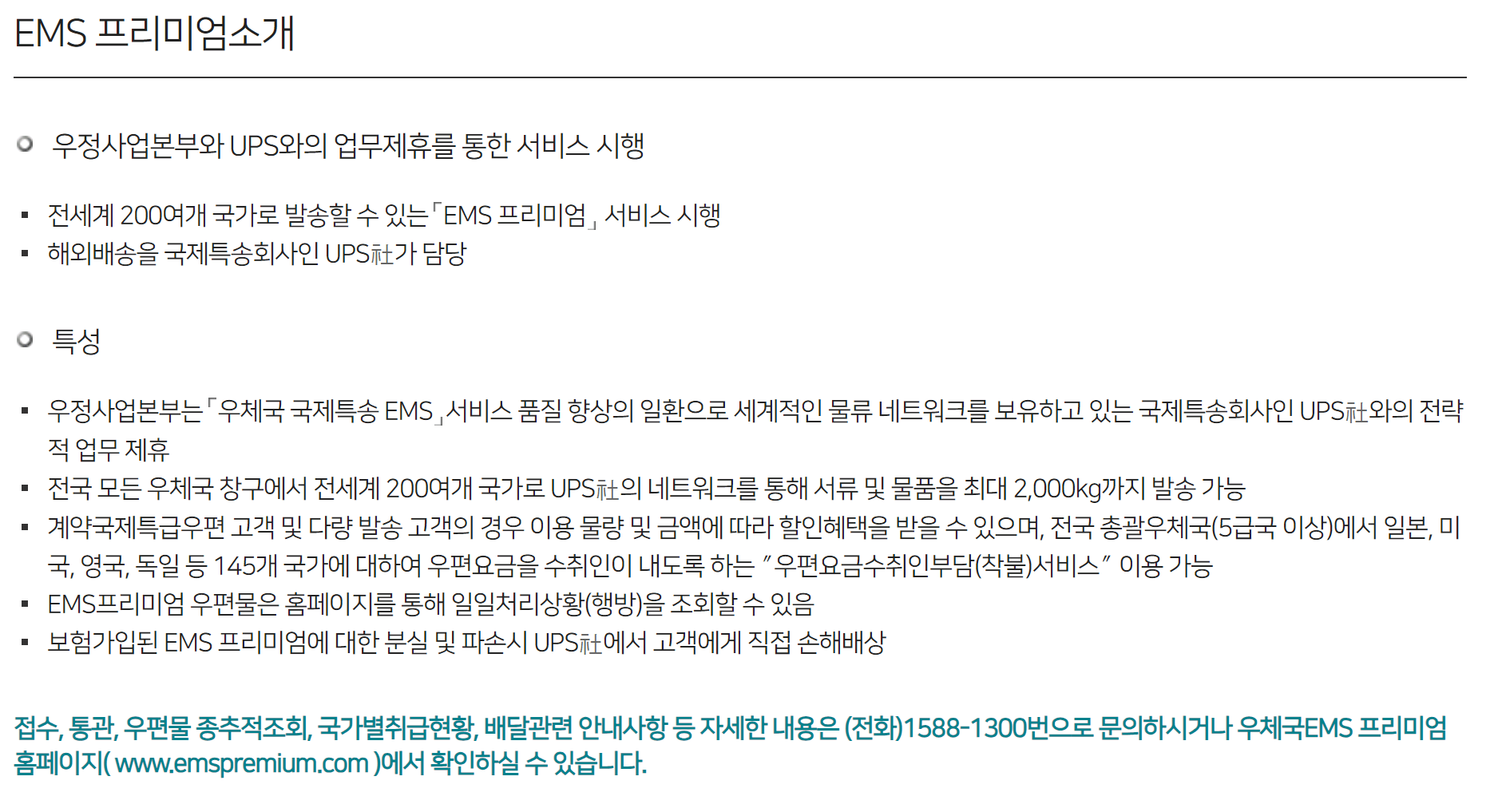 EMS 프리미엄은 이름만 보면 EMS와 비슷한 배송방식처럼 보이지만 실상은 아주 다른 서비스입니다. EMS가 국가간 협정에 따른 국제우편망을 통해 우편과 택배를 보내는 서비스라면, EMS 프리미엄은 우정사업본부가 UPS라는 국제특송회사와의 계약을 통해 배송을 합니다. 전세계 200여 국가에 물류 네트워크를 보유한 UPS사를 통한 배송이다 보니 아무래도 가격은 EMS 보다 더 비쌉니다. 하지만 보낼 수 있는 국가의 폭이 넓고 택배의 무게나 품목에 있어서 다른 배송방식보다 좀 더 유연합니다.